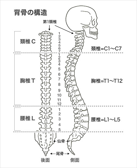 背骨は1本の骨でできているのではありません。椎骨という24個のパーツから成り立っており、首の部分が頸椎、胸の部分が胸椎、腰の部分が腰椎と呼ばれます。これらに、おしりの骨である仙骨と尾てい骨を加え、全体を背骨と総称します。